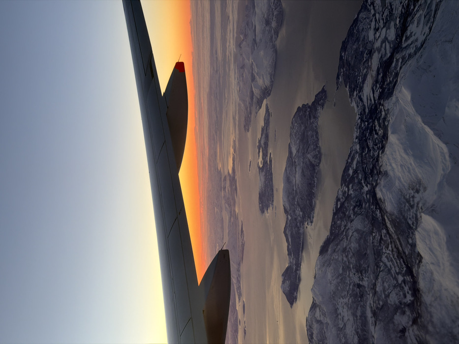 From an airplane window, a wing divides the composition. Above, a gradient sky transitions from blue to orange. Below, a landscape unfolds featuring islands and snow-covered mountains. The lighting suggests either sunrise or sunset, casting a warm glow on the scene. The terrain appears rugged and remote, hinting at a polar or high-altitude location.