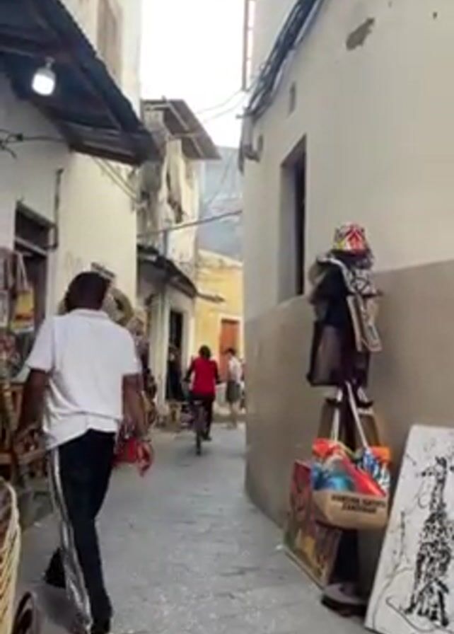 The video depicts a narrow street in a town, likely a marketplace due to the presence of various goods being displayed