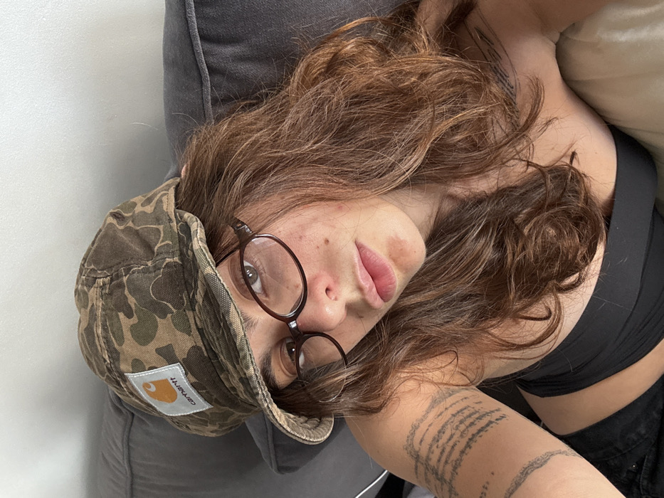 The image depicts a young adult female in an indoor setting, identified as Givatayim, Israel. The individual, positioned from the chest up and angled slightly, has long, wavy reddish-brown hair. She is wearing a camouflage-patterned bucket hat with a white Carhartt logo on the front, and dark-rimmed oval glasses. Her facial features include medium-brown eyes, a neutral to slightly pouting expression, and visible minor skin irregularities. She is dressed in a black strapless top, and a multi-line, abstract tattoo is visible on her upper left arm. The individual is looking directly at the camera. She appears to be seated or reclining against a dark grey upholstered surface, likely a sofa or cushion, with a plain light-colored wall visible in the upper background.