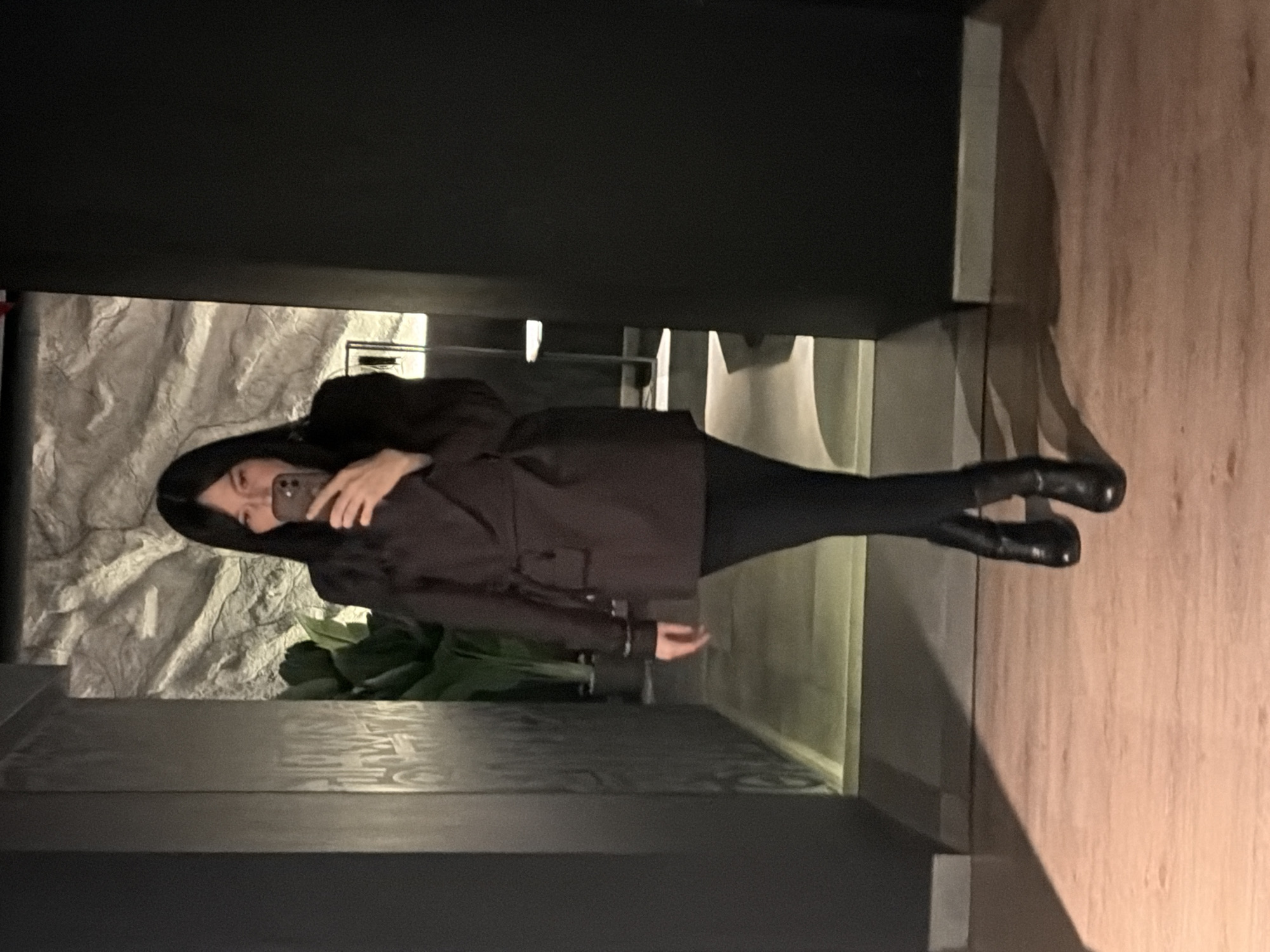 A woman is taking a mirror selfie indoors. She is wearing a dark coat, black pants, and black boots. The background includes a wall with a textured surface, a decorative plant, and a wooden floor. The exact location in Chaikovsky, Russia, is not discernible from the image.