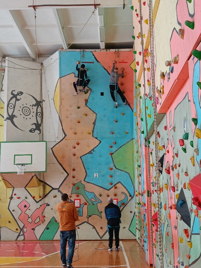 Indoor rock climbing gym featuring two individuals climbing a tall, colorful wall