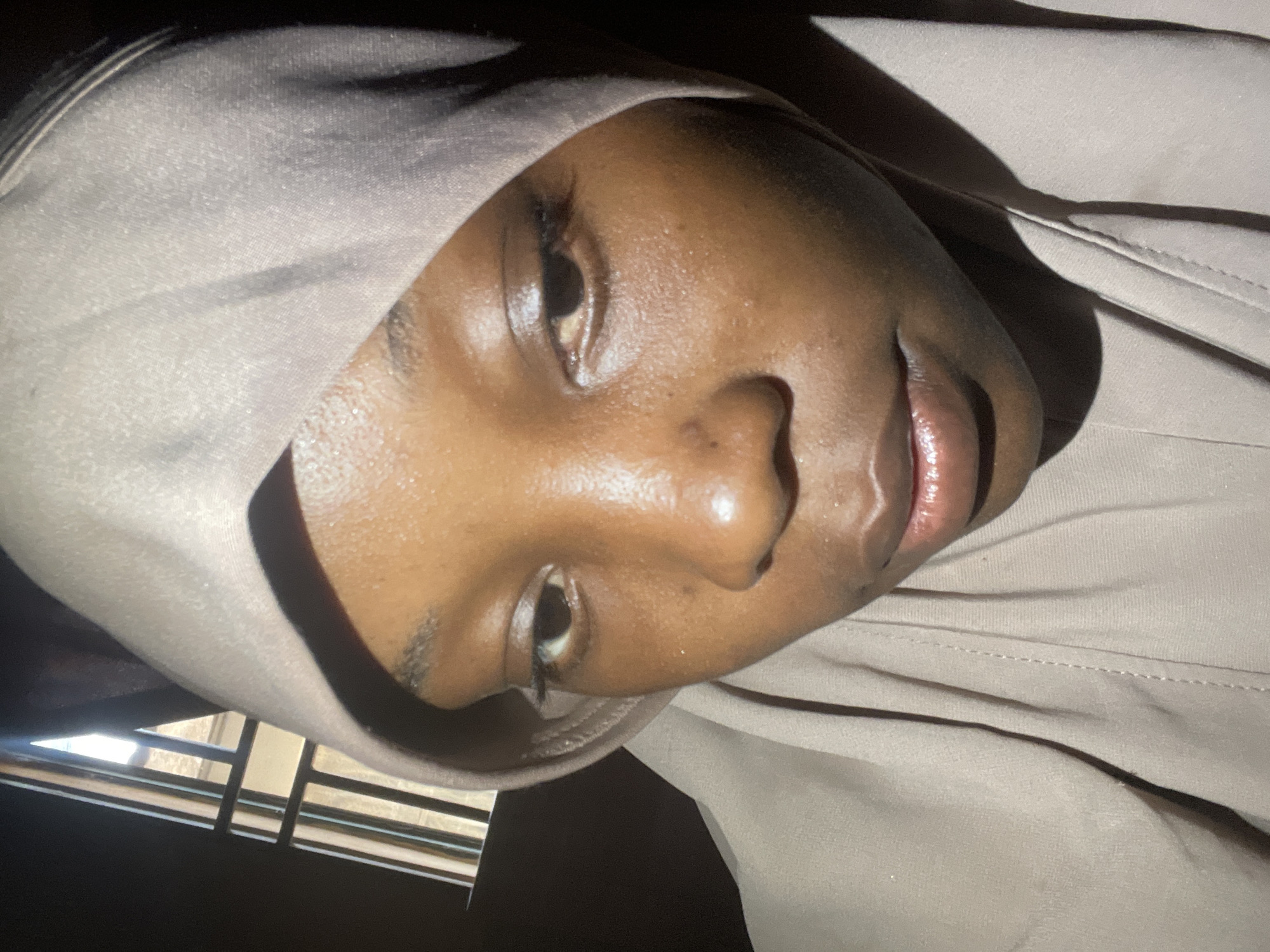 A close-up, indoor photograph depicts a young individual, likely female, with dark skin, wearing a light beige or pale brown head covering that drapes over the head and shoulders