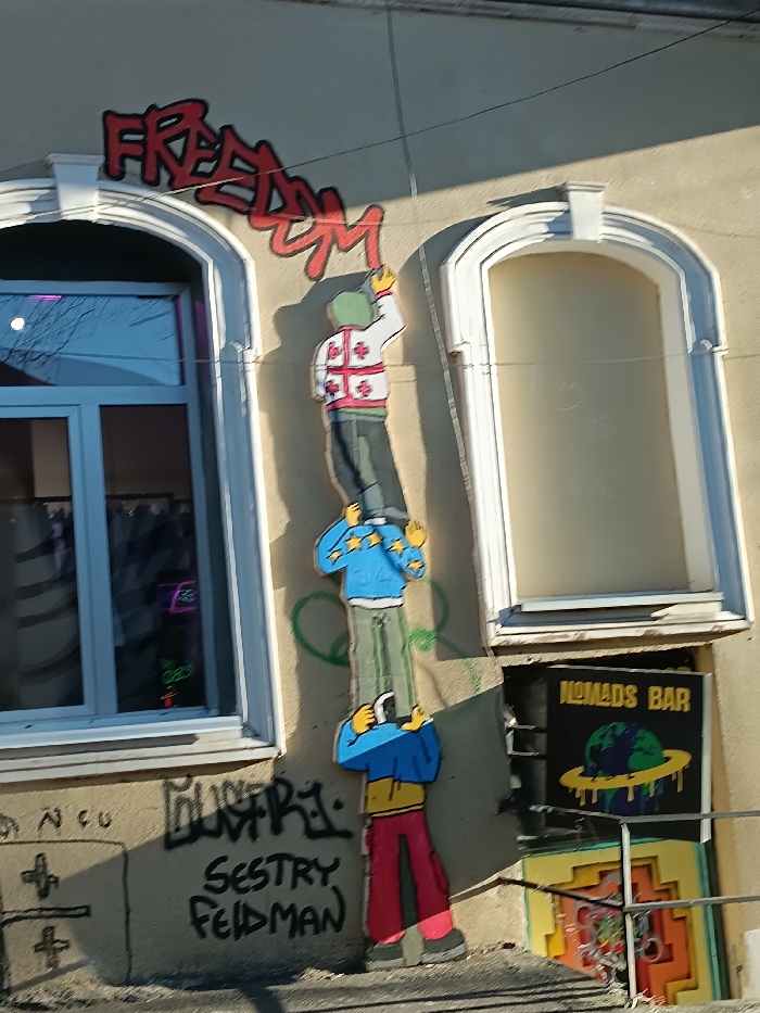 The image depicts a section of a light-colored building facade in Tbilisi, Georgia, illuminated by strong sunlight casting sharp shadows. The central feature is a vertical street art installation composed of three stylized, multi-colored human figures, appearing to be flat cutouts, stacked atop one another in a human pyramid formation. The topmost figure, wearing a green cap, a white sweater adorned with red crosses (resembling the Georgian flag's Bolnisi crosses), and dark trousers, extends an arm upwards. This figure holds a yellow object, appearing to be a spray can, and is depicted as spray-painting the word "FREEDOM" in red bubble letters directly above its head on the wall. The middle figure, clad in a blue sweater embellished with yellow stars (reminiscent of the European Union flag's stars) and dark trousers, supports the figure above it. The bottom figure, dressed in a blue top with yellow trim, red trousers, and dark shoes, supports the middle figure. To the left of the figures is a modern, white-framed window with multiple panes, reflecting a blue sky and bare tree branches. To the right, an arched, white-framed window niche is present, appearing to be sealed or covered. Below this arched niche is a black rectangular sign with the text "NOMADS BAR" in yellow, featuring a graphic of a melting globe with a yellow ring. Below the left window, black graffiti text reads "LUDOVICO" (partially obscured) and "SESTRY FELDMAN." Faint green spray paint marks are visible on the wall surrounding the figures, and a faded outline of a Georgian cross symbol is present on the lower left wall. Overhead, thin wires or cables traverse the upper portion of the frame.