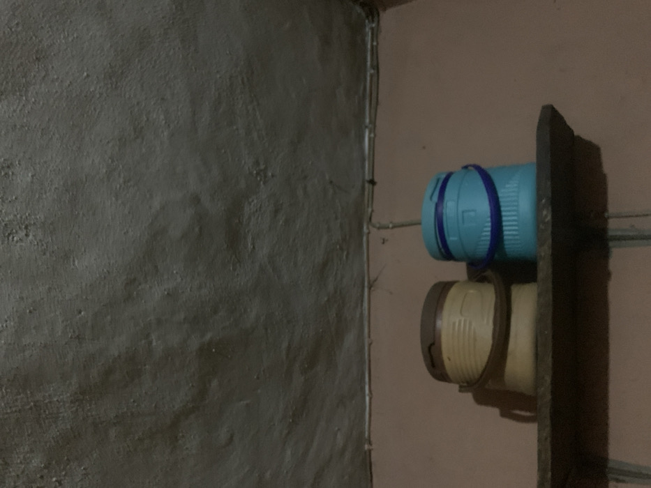 A gray, textured wall occupies the left side, its surface uneven and dimly lit. To the right, a light pink wall is partially obscured by a vertical object, appearing dark and rough. Two cylindrical containers are mounted on this object: one light blue with dark blue bands and another tan with a dark brown cap. Plumbing pipes are visible running along the intersection of the walls.