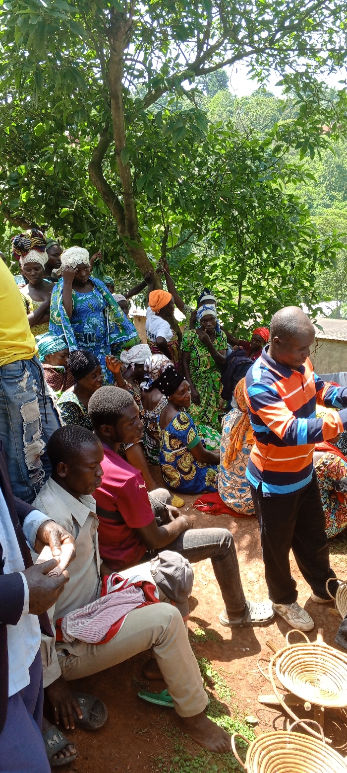 A group of people, predominantly women in colorful traditional clothing and head coverings, are seated outdoors in a shaded area. A few men are also present, one wearing an orange and blue striped shirt. Some people are seated on the ground, while others are elevated slightly. Woven baskets are visible in the foreground. A tree provides shade. The setting appears to be a gathering or meeting in a rural location.
