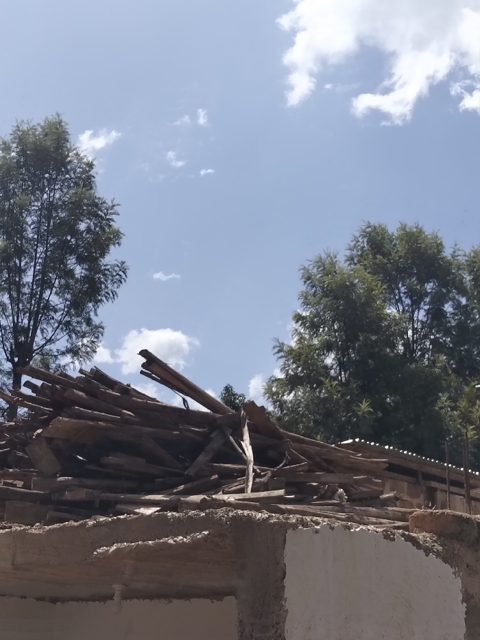 The image depicts an outdoor scene in Nyansiongo ward, Kenya, under a clear blue sky with scattered white cumulus clouds. In the foreground, the top of a concrete or masonry structure is visible, characterized by rough, uneven edges, suggesting a building under construction or demolition. A substantial pile of assorted wooden planks, beams, and debris rests atop this structure. To the right, portions of what appear to be corrugated metal roofing sheets are visible, lying horizontally. A single white, incandescent-style light bulb hangs suspended from an overhang beneath the main concrete structure. Two large trees with dense green foliage frame the scene, one on the far left and another on the right, extending upwards towards the sky. No individuals are present in the frame, and no discernible actions or interactions are depicted.