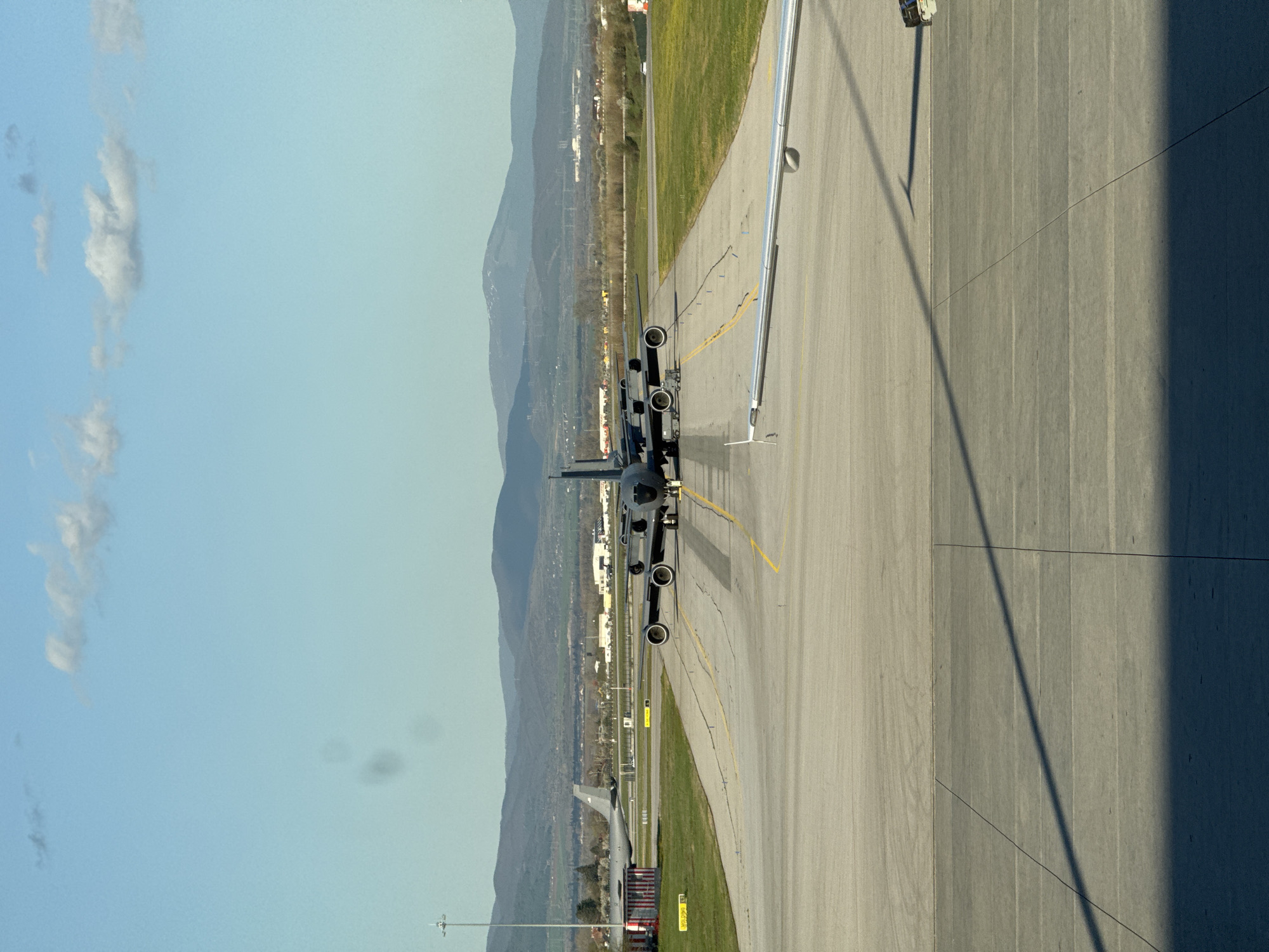A photograph captures an aerial view of two military aircraft situated on a runway, with mountains visible in the background. The sky is clear and blue with sparse clouds. An object, seemingly attached to a building, is seen in the far right foreground. The image is oriented vertically, and the location is not identifiable as Sofia, Bulgaria.
