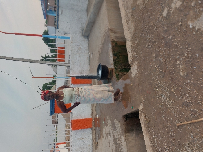 An elderly woman stands on a concrete surface, holding a black basin filled with water. She wears a light-colored top, a patterned skirt, and a red headscarf. Behind her is a white fence with orange and blue accents. A building is visible in the background. Water spills from the basin onto the concrete, which also has a dark opening. A stick rests on the dry, cracked earth next to the concrete.