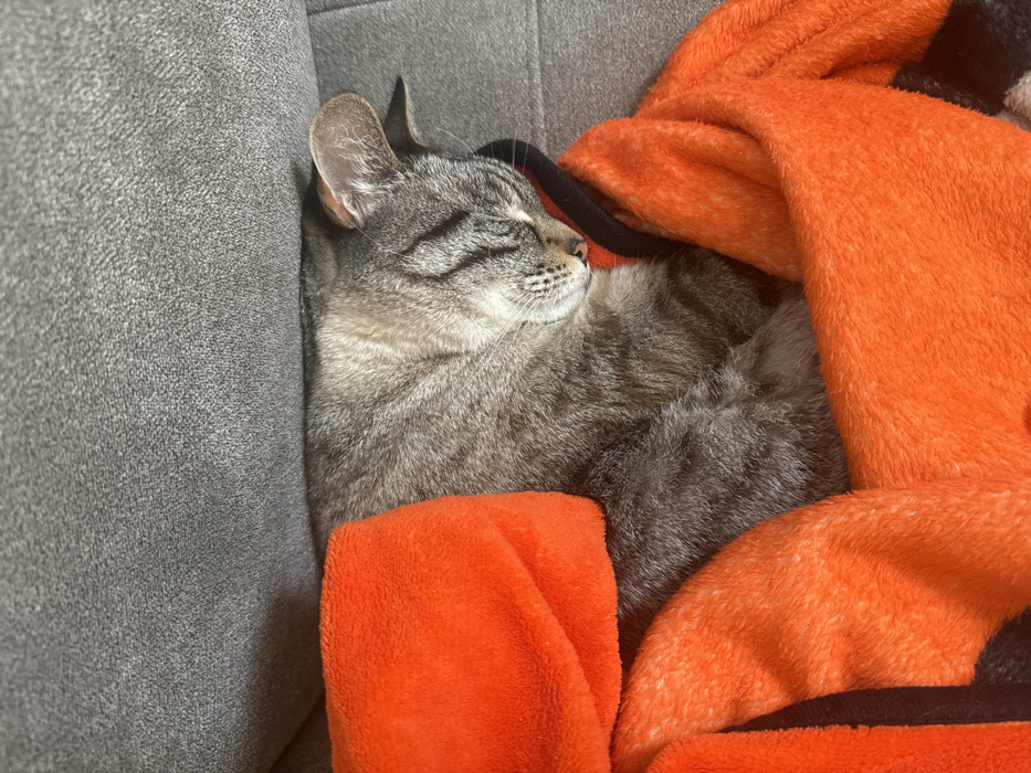An indoor domestic scene in Unknown, Unknown, depicts a single, grey and brown tabby-patterned domestic cat sleeping on a textured light-grey fabric sofa. The cat is curled on its left side, with its eyes closed and whiskers visible. It is partially enveloped by a bright orange, plush fabric blanket, which covers its body and forms a pillow-like support for its head. A thin black fabric edge is visible beneath the cat's chin, nestled between its face and the orange blanket. The environment suggests a quiet, comfortable setting. No other subjects or objects are discernible in the immediate vicinity.