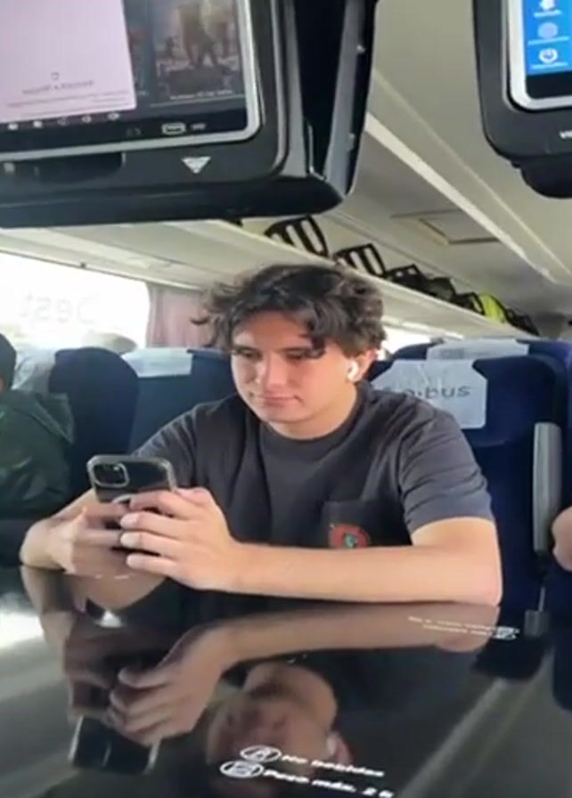 A bus passenger is seen sitting at a dark, reflective table in a bus. He has dark curly hair and is wearing a black t-shirt. He is looking at his cell phone, which he holds with both hands. He wears wireless earbuds. The table reflects his face. Other passengers can be seen. Two television monitors hang above the tables. The monitors show various options, including movies, to the passengers. Text is visible on the table, below his reflection. "socibus" is printed on the seats. The window is partially visible.