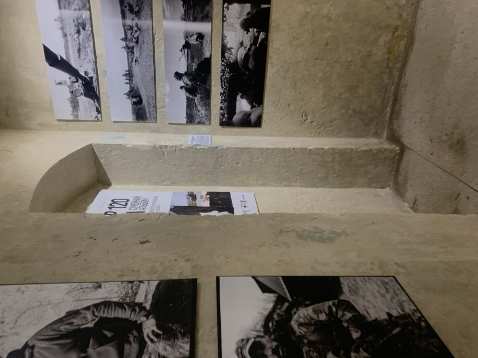 The scene is a room with old, textured walls. Black and white photographs are mounted on the wall. In a small alcove in the wall, a poster is displayed. Two other photographs lie on the floor in the foreground. The scene is dimly lit.