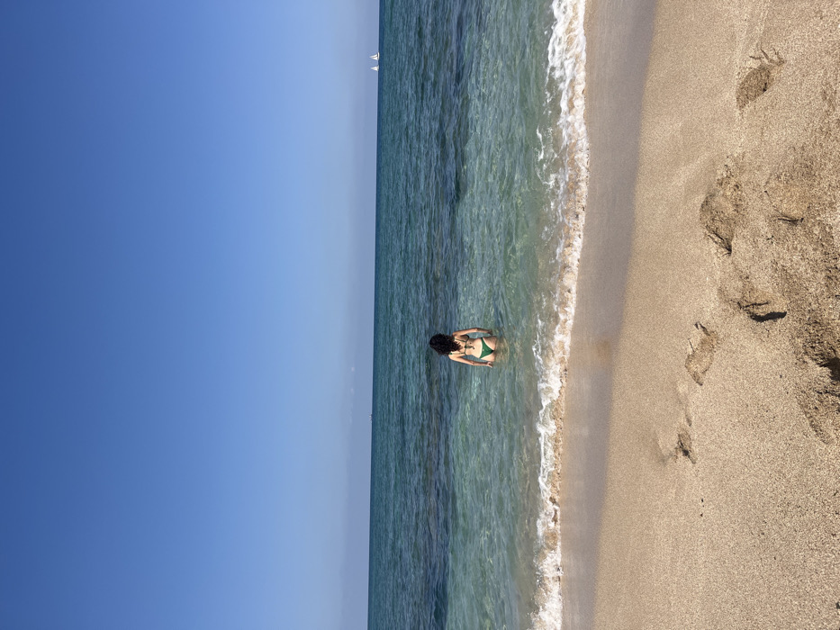 - "The image displays a sandy beach in Haifa, Israel, with a person wading into the Mediterranean Sea under a clear blue sky" by FM-IhPCF2, licensed under CC BY 4.0