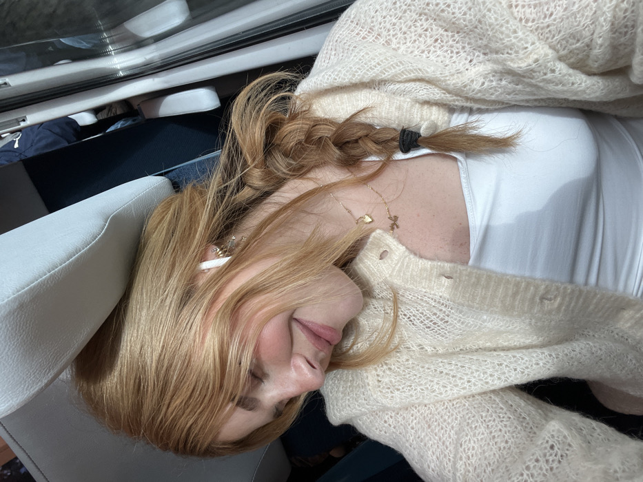 young woman sitting in a train seat, looking down and smiling. She is wearing a white knitted cardigan over a white tank top. She has long blonde hair, braided on one side. The woman is wearing two gold necklaces, one with a heart pendant and the other with a bow pendant. Her right ear is adorned with a white, heart-shaped earring. The scene is inside a train, with a window on the right side. The train is located in Asnières-sur-Seine, France, with coordinates 48.91 latitude, 2.269 longitude. The environment appears to be a modern train car. The image appears to be a personal snapshot, taken by the woman herself.