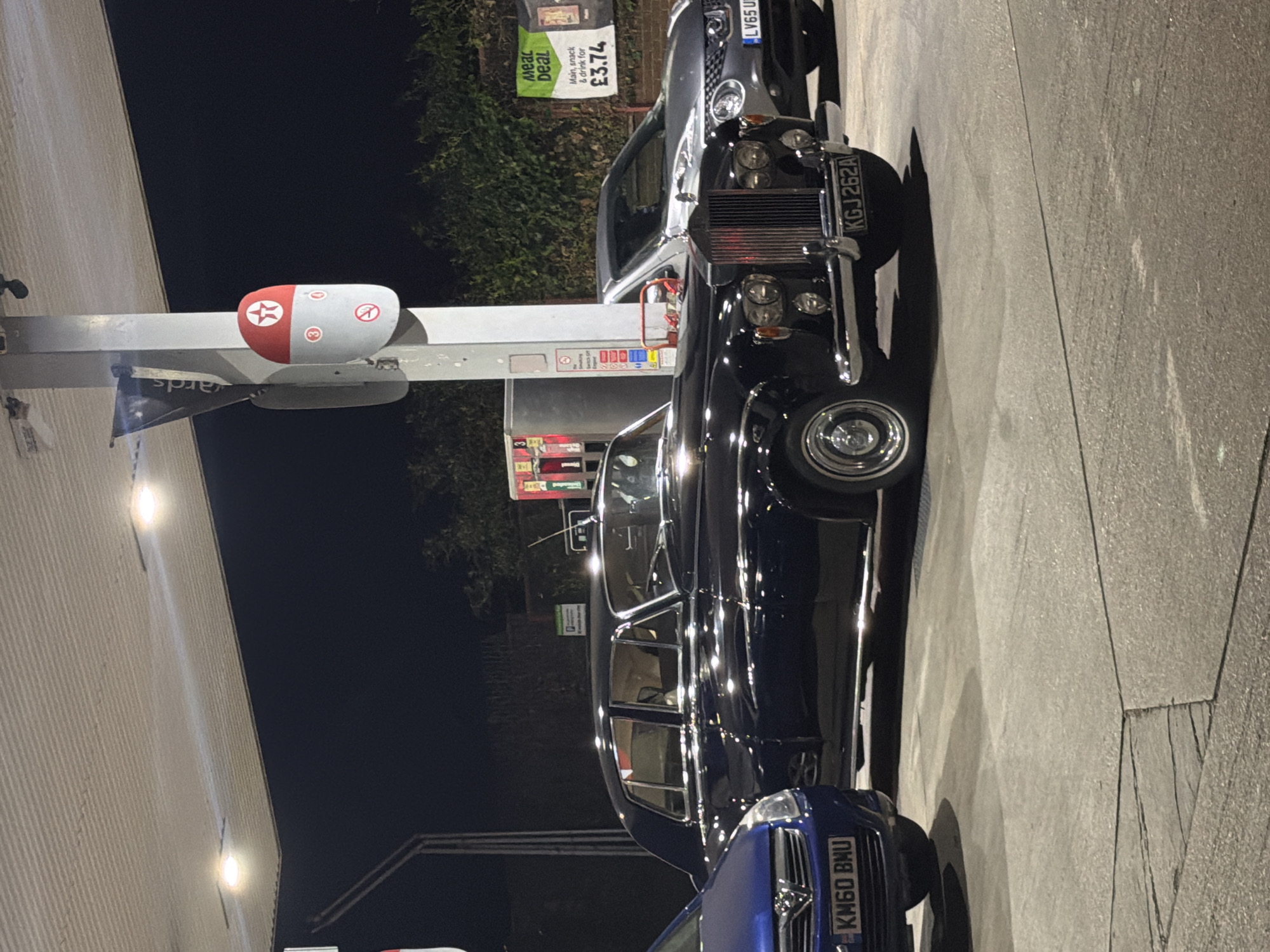 The scene captures a Texaco petrol station at night in London, United Kingdom. A classic black Rolls Royce stands prominently beside a petrol pump with a red and white branded dome. Parked nearby is a blue Vauxhall. Signage advertises a "Meal Deal" for £3.74. The environment is typical of a roadside petrol station, with dark night sky, and a bright area illuminated by artificial lighting. No people are visible.