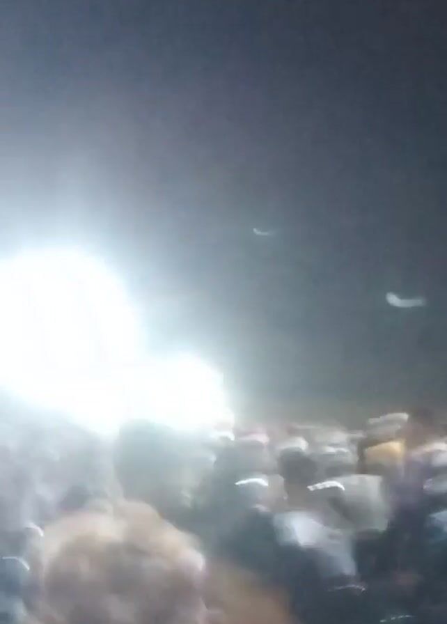 dark scene with a crowd of people. There are bright lights shining over the crowd. The camera moves around, making the scene blurry. It's difficult to make out many details.