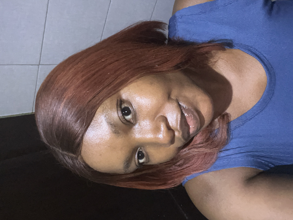 A woman with shoulder-length, auburn hair and dark eyes looks toward the camera. She has smooth, glowing skin. The woman wears a blue ribbed shirt. A tiled wall is visible behind her head. The background on the bottom left appears black. The image is shot at an angle, seemingly from above her.