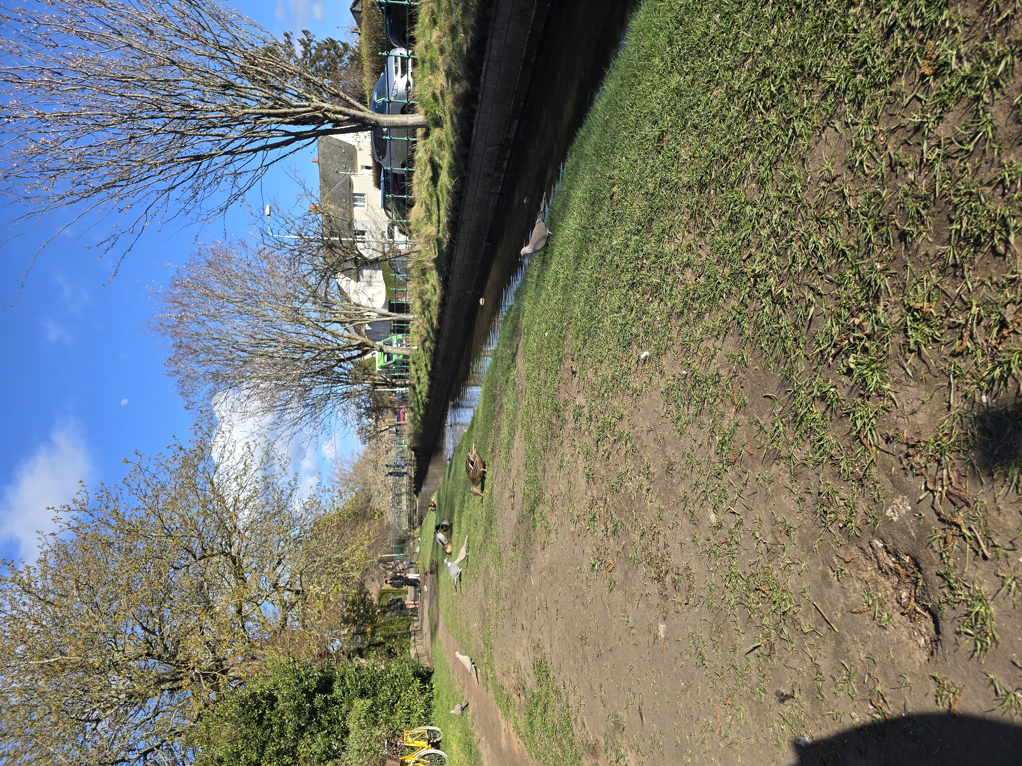 The scene is a park setting in St Andrews, United Kingdom, adjacent to a narrow canal or waterway. A footpath runs alongside the canal, covered in patches of grass and dirt. Several birds, including pigeons and ducks, are present. A group of people can be seen further down the path. A yellow bicycle is leaning against bushes near the foreground. Trees with bare branches line the canal, and buildings and vehicles are visible in the background across the canal. The sky is blue with scattered clouds.
