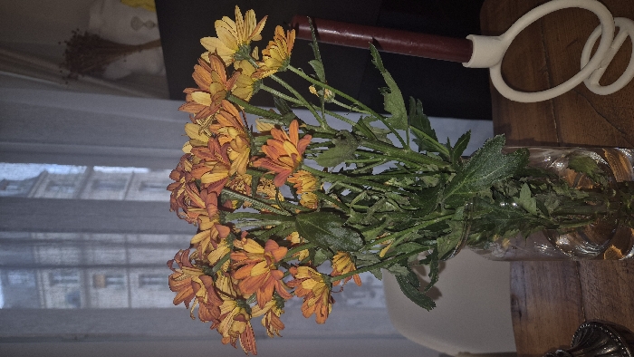 The image displays an indoor scene overlooking an urban environment in Paris, France. In the foreground, a bouquet of orange and yellow chrysanthemum-type flowers is arranged in a clear glass vase, resting on a dark, rustic wooden table. To the left of the vase, a partially visible ornate metallic object is present. To the right, a white, modern-design candlestick holds a dark red candle. The background features a sheer, light-colored curtain drawn across a window, through which a multi-story Haussmann-style building, characteristic of Parisian architecture, is visible. Further right in the background, a small arrangement of dried, brown botanical material is placed on a dark surface, next to a blurred yellow object. No individuals are depicted.