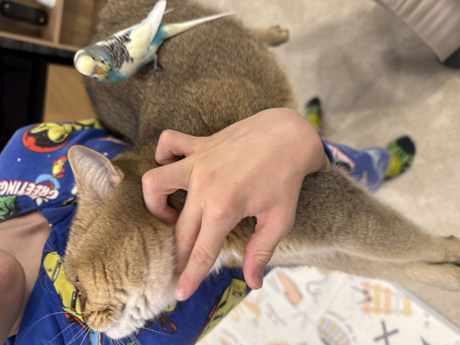 A tan cat sits on a person's lap wearing blue pajamas with comic book characters. A small, light-blue parakeet rests on the back of the cat, near the person's chest. The person's hand is on the cat's neck, gently petting it. One of the person's feet in socks with green and yellow patterns is visible in the background.