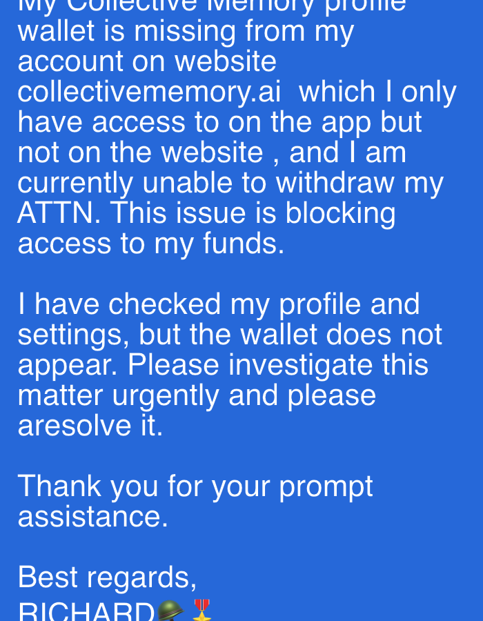 The image displays a digital message, likely a screenshot of an email or chat, rendered with white text on a solid blue background. There is no discernible physical location, including Ajara, Nigeria, or any visible physical environment, people, or objects within a real-world scene. The primary subject is the textual content, which constitutes a formal request for assistance. The message originates from a sender identified as "RICHARD," whose name is followed by a green military helmet emoji and a red and gold medal emoji. The communication describes an issue with a "Collective Memory profile wallet" that is reported as missing from RICHARD's account on the website "collectivememory.ai." He states that he can access this wallet via an application but not through the website, which prevents him from withdrawing "ATTN." RICHARD asserts that this issue is blocking access to his funds. He further indicates that he has checked his profile and settings without the wallet appearing. The message concludes with an urgent request for investigation and resolution, followed by a formal closing. The actions depicted are limited to the act of digital communication, with RICHARD conveying a problem and requesting a solution.