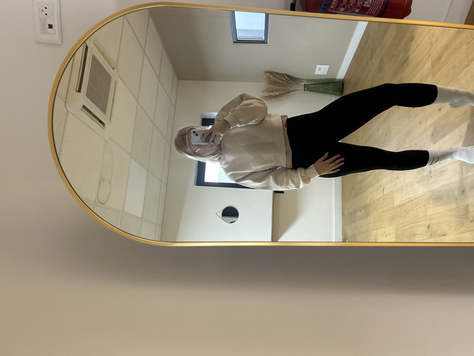 The image displays an indoor scene in Andrézieux-Bouthéon, France, captured as a self-portrait reflected in a large, gold-framed, arch-top mirror. A female subject, with blonde shoulder-length hair and glasses, is holding a light-colored smartphone in her right hand to take the photograph, partially obscuring her face. She is dressed in a beige cropped sweatshirt layered over a lighter top, black leggings, and white socks, one of which displays a black logo. The reflected environment reveals a room with light beige walls and a light-colored wooden plank floor. The ceiling is composed of white acoustic panels, featuring a rectangular air conditioning unit. On the left wall, a small round black-framed mirror hangs above a wooden shelf or barre. A large dark-framed window is visible on the left side of the reflection, with a smaller dark-framed window on the right. Towards the right, a tall green vase holds dried pampas grass plumes, adjacent to a white double electrical outlet featuring a small black cat face design on the wall. A red fire extinguisher is partially visible at the far right edge of the mirror's reflection.