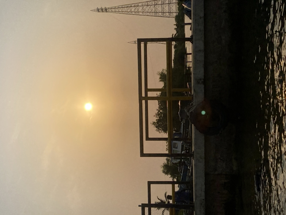A tranquil view displays the sun low in the sky, shrouded in a hazy orange glow. An electricity pylon rises in the background, while a dark metallic structure with yellow bars is prominently featured in the foreground, casting shadows on the concrete pier it's attached to. Calm water reflects the light, with a round fender suspended from the pier's edge. Silhouetted trees and vehicles hint at activity beyond the pier's edge.
