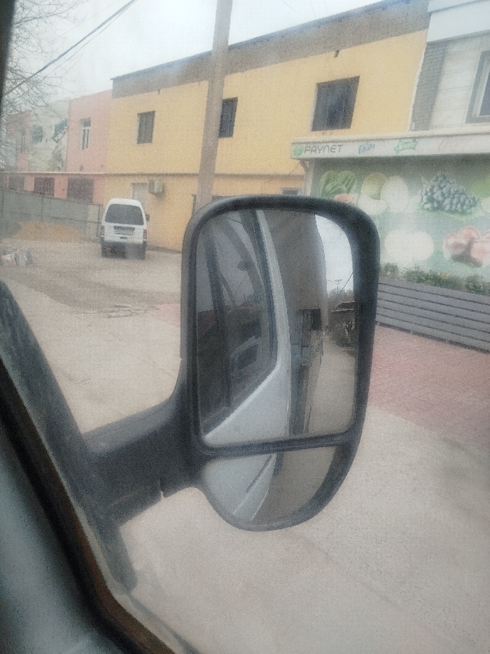 The image depicts an outdoor street scene in Yangiaryk, Uzbekistan, viewed from inside a vehicle through a dusty windshield and partially through the vehicle's passenger-side mirror. In the foreground, a black, rectangular side-view mirror with rounded corners is positioned in the mid-right, reflecting a portion of the light-colored vehicle it is attached to and the ground immediately to its right. A dark-colored interior vehicle frame is visible in the lower-left. In the midground, a light-colored dirt or paved road extends into the distance. A white cargo van or minibus is parked facing away from the viewer on the left side of this road. A tall, light-colored utility pole stands vertically in the center-right, partially obscured by the mirror. The background features multiple buildings under an overcast sky. A prominent two-story building with a pale yellow facade occupies the center-right. It has several dark, rectangular windows and an external air conditioning unit mounted on its wall. Below the windows, a green sign bearing the text "PAYNET" is visible. Beneath this sign is a mural or large print depicting various fruits and vegetables, including grapes, melons, and onions, suggesting a market or grocery establishment. To the left of the yellow building, a portion of a building with a light pink/peach facade is visible. To the far right, a segment of a building with a grey sloped roof or awning structure is seen above the fruit mural. Bare tree branches are visible against the sky in the upper-left corner. No individuals are discernible in the scene.