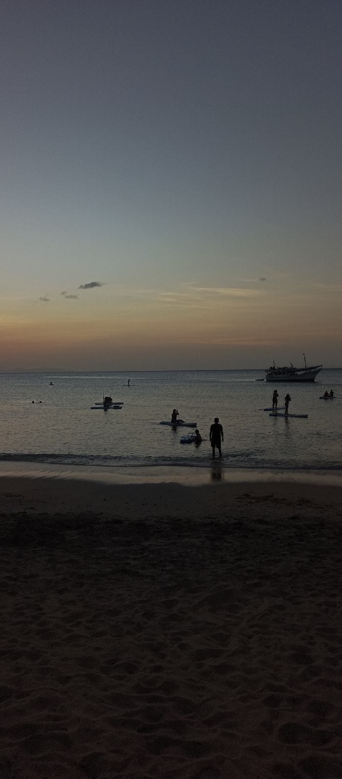 This image displays an evening coastal scene in Juan Griego, Venezuela, during twilight. The sky is characterized by a gradient from dark blue-grey at the top, transitioning to horizontal bands of muted orange and yellow above the horizon, with several small, wispy clouds visible. The foreground comprises a dark sandy beach. A thin line of breaking waves marks the interface between the beach and the ocean. The water is relatively calm and dark, reflecting the ambient light. Multiple human figures are present in the water, appearing as dark silhouettes. Near the right foreground, one individual stands partially submerged in the water, while another is on a small flotation device beside them. Further into the water, two separate individuals are actively paddleboarding, standing upright. To the left, another person is on a paddleboard, and an additional individual is partially submerged in the water adjacent to a dark, rectangular floating platform. In the far-right distance, a multi-decked boat with a white hull and darker superstructure is observed moving across the water. All visible individuals are engaged in recreational water activities.