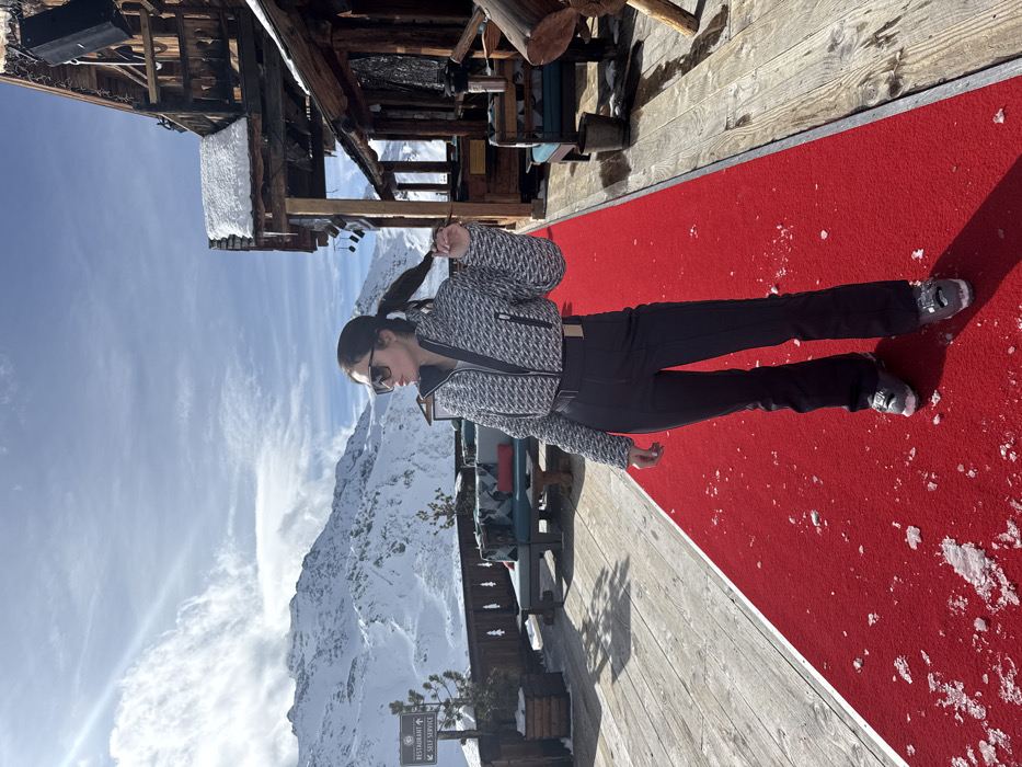 A female individual stands on a snow-dusted red carpet laid over a wooden deck at La Folie Douce Val Thorens, located within Saint-Martin-de-Belleville, France