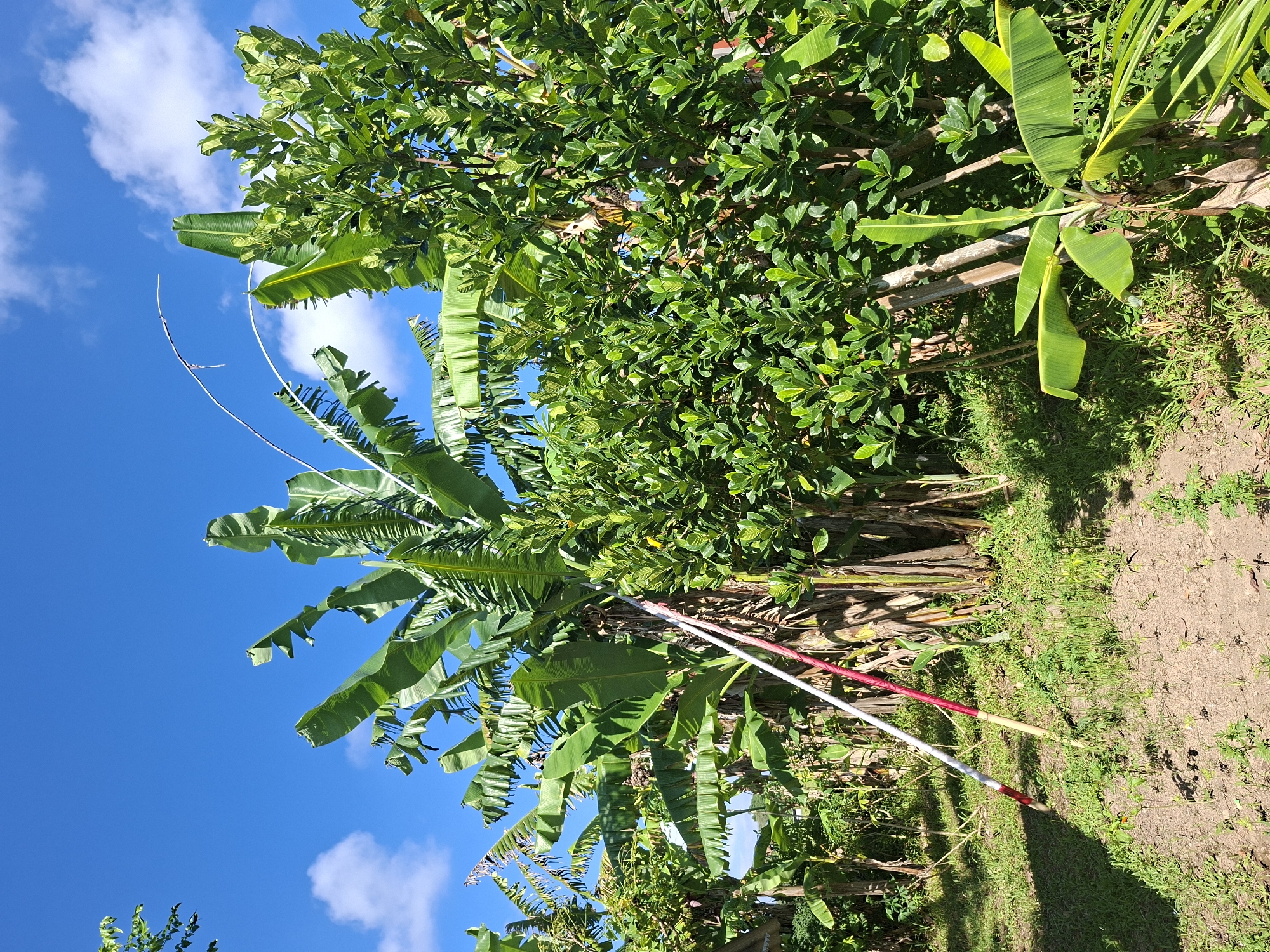 The scene is an outdoor view of dense tropical foliage under a bright blue sky with scattered white clouds, likely in Lodtunduh, Indonesia. Banana trees with large, green leaves are prominent, interspersed with other leafy trees featuring smaller, denser foliage. Two colorfully striped poles rest on the ground amid some sparse grass and vegetation. The ground transitions to a bare, earthy surface near the poles.