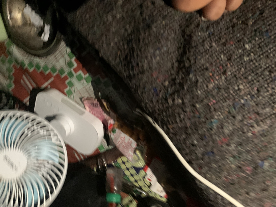 The image depicts a close-up, high-angle view of a cluttered indoor space in Zaki Biyem, Nigeria. In the upper left, a white personal fan with light blue, motion-blurred blades is visible. To its right, a white rectangular electronic device, possibly a power bank or portable speaker, rests on a patterned fabric featuring red, green, and white geometric designs. A metallic bowl is positioned in the upper right. Near the mid-left, a clear plastic bottle with a green cap is partially visible, adjacent to another piece of patterned fabric with green, yellow, and white motifs. A dark, elongated object extends diagonally from the mid-left to the lower-right, alongside which a white cable runs. The foreground and much of the lower-right portion of the frame are covered by a dark gray, textured material, possibly a carpet or blanket, embedded with multi-colored flecks. The lower portion of a hand with brown skin and short fingernails is visible in the bottom right corner, resting on this textured surface. No discernible direct interactions between individuals or the fan are evident beyond the fan's operational state.