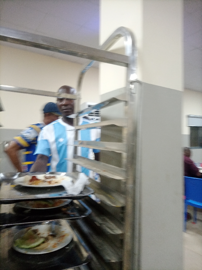 A man with a bald head is seen behind a metal dish rack. He's wearing a white and light blue striped jersey. Plates with leftover food are stacked on the rack. In the background, another person is wearing a blue and yellow shirt. A person sitting on a blue chair is visible to the right. The setting appears to be a cafeteria or similar dining area.