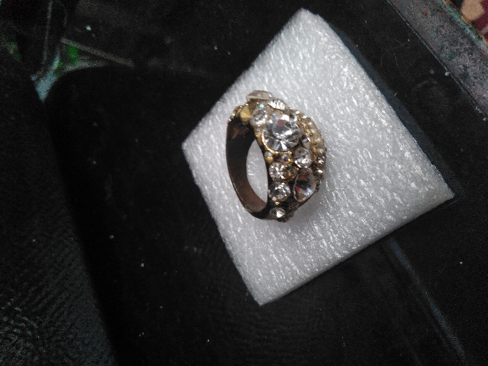 A close-up image displays a single, ornate ring positioned on a small, white, rectangular block of expanded polystyrene foam. The ring features a tarnished gold-toned metal band and is heavily encrusted with numerous clear, faceted stones of varying sizes, simulating diamonds. One large, round central stone is prominent, surrounded by smaller, similarly faceted stones. The foam block measures approximately 3-4 cm per side and has a textured, porous surface. Both the ring and the foam block rest upon a dark, reflective surface, possibly glass or polished plastic, which exhibits some dust particles and faint reflections. The background is predominantly dark and out of focus, offering no discernible details or identifying features. No individuals, actions, or specific environmental indicators are present to identify the location within Charleroi, Belgium, or any other geographical area.