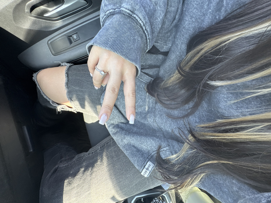 The image displays a first-person, downward view of an individual seated in the passenger side of a vehicle. The individual wears dark grey distressed jeans with a visible tear at the left knee, and a faded grey long-sleeved top or hoodie with a partial "SNSWEAR" label on the left side. The right hand is positioned in a "V" gesture, with the index and middle fingers extended and the remaining fingers curled. The fingernails are square-tipped and painted with a light, possibly white, polish. A silver-toned ring featuring a clear, oval-shaped stone is worn on the ring finger. Long, dark hair with prominent light blonde highlights cascades forward over the grey top. The immediate environment consists of the dark interior of the vehicle, with portions of a dashboard or console visible to the left of the legs, and a car door panel with a power window switch visible to the right. The specific location within the city of Plovdiv, Bulgaria, cannot be determined from the visual information present in the image.