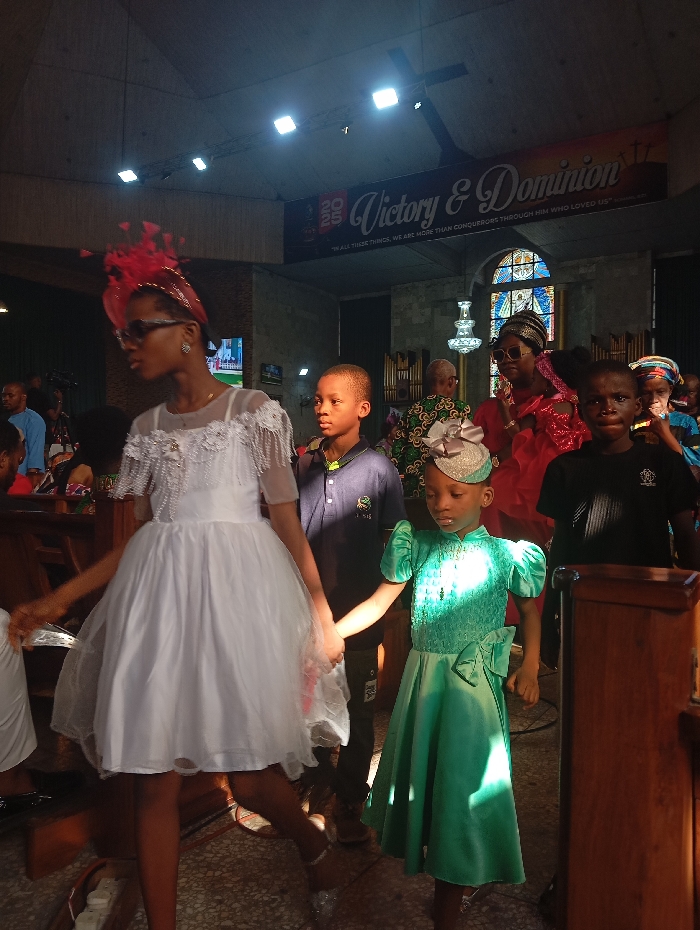 The image depicts the interior of a church in Fegge, Nigeria, during an event. In the foreground, a young female, approximately early teens, walks forward, wearing a white, short-sleeved formal dress with a sheer embellished overlay, a red feathered fascinator, dark sunglasses, a pearl necklace, and silver glitter shoes with an ankle bracelet. She holds the left hand of a younger female child, approximately 5-7 years old, who is dressed in a bright green formal dress with puffy sleeves, a textured bodice, a large bow at the waist, and a matching green fascinator. Both individuals are moving down an aisle. To their left, a male child in a dark blue polo shirt with a logo stands looking forward. In the mid-ground, several other individuals are visible; an adult female in a red top with sunglasses and a patterned headwrap stands near a chandelier and a stained-glass window depicting a figure. Another male child in a black t-shirt is partially visible on the far right. The environment includes wooden church pews bordering the aisle. The background features a high ceiling with multiple bright square LED lights. A large banner hangs prominently, displaying "2025 Victory & Dominion" along with the text "IN ALL THESE THINGS, WE ARE MORE THAN CONQUERORS THROUGH HIM WHO LOVED US." Sunlight enters the building, creating bright illumination on the floor and subjects. The floor appears to be a light-colored tile, and some electrical wiring is visible on the floor near the pews.