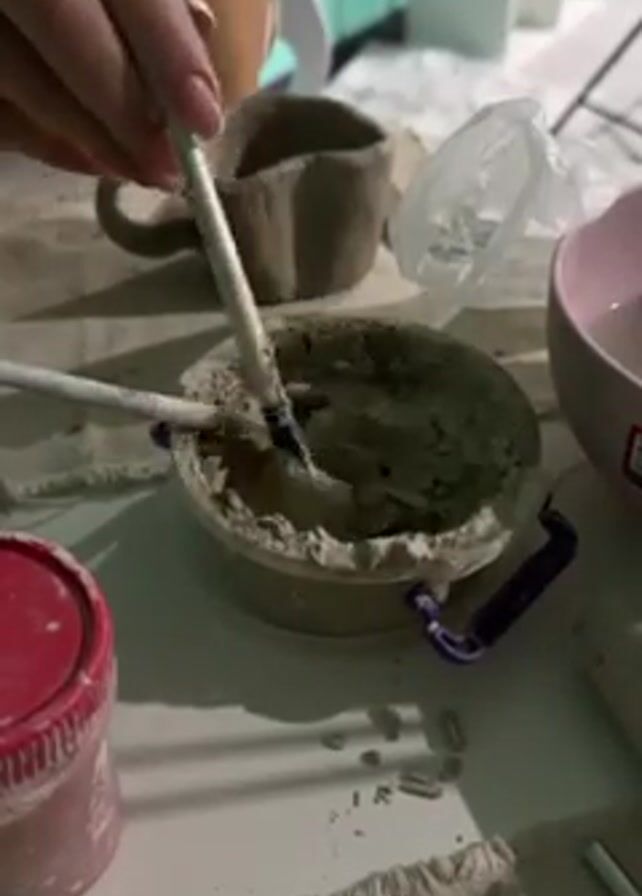 A person is mixing a thick, light-colored substance, possibly clay, in a small, round container with a paintbrush