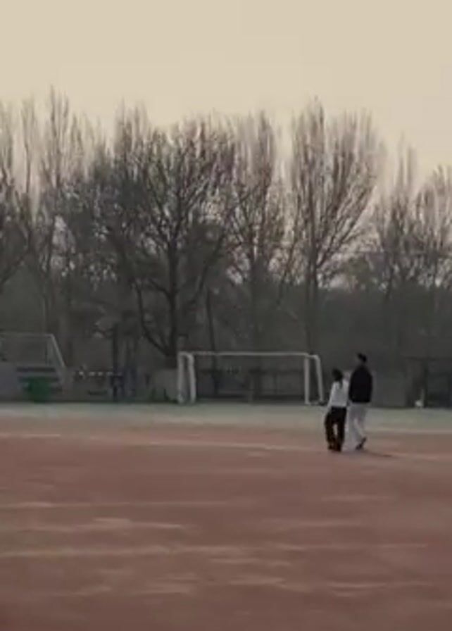 sports field with a running track surrounding a grassy area, likely used for soccer. In the first part, the sky appears overcast with a grey or hazy quality. Two people, a male and a female, walk together across the running track. The trees in the background are bare, suggesting it is winter or early spring. There is a soccer goal in the background. The second part of the video shows a group of people gathered around one of the soccer goals, with a soccer ball nearby. Some of them appear to be warming up or preparing to play. The sky is brighter in this part, though the color is still muted.