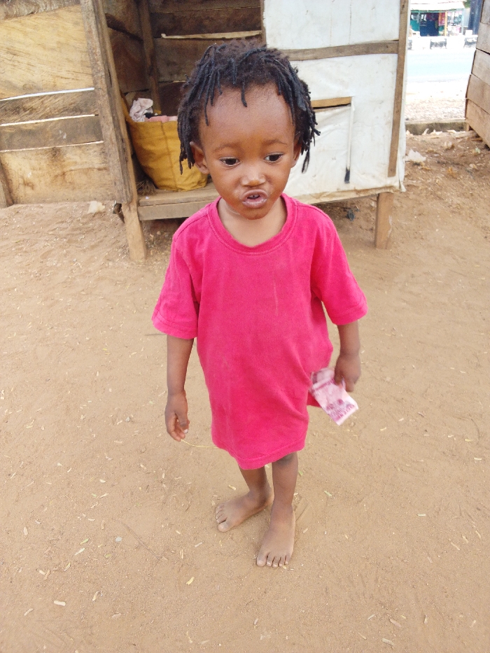 A young child stands center-frame on a dry, sandy-dirt surface scattered with small debris, likely in Adankolo, Nigeria