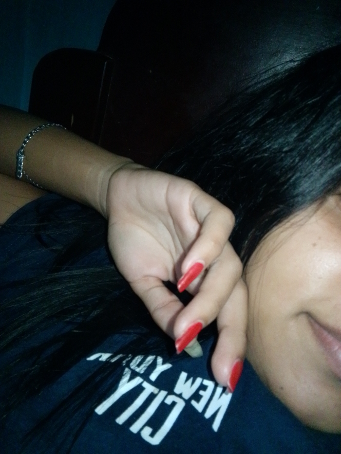 A woman lies with black hair cascading over a blue T-shirt with white "NEW YORK CITY" text. Her right hand rests on the shirt, adorned with red nail polish. A silver bracelet circles her wrist. A portion of her face, including her cheek and lips, is visible. The background shows a dark headboard. The lighting appears dim.