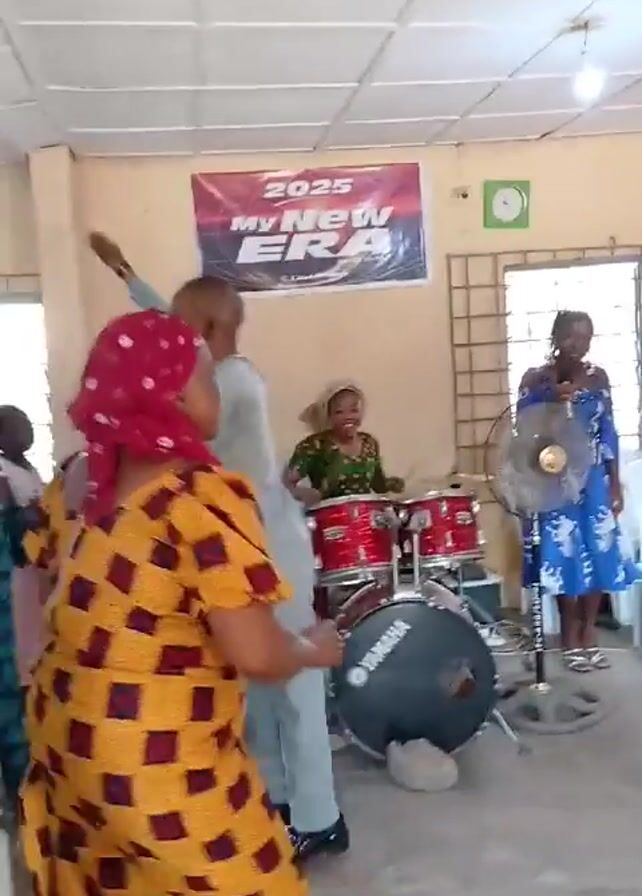 A video captures a vibrant church service. The setting is a small, brightly lit room with a banner reading "2025 My New Era" hanging on the wall. The focus is on a woman in a yellow and brown patterned dress with a red headscarf, dancing to the music. Behind her, a band is playing, including a female drummer, while other congregants sing and dance. A standing fan circulates air, and the overall atmosphere is joyful and celebratory.