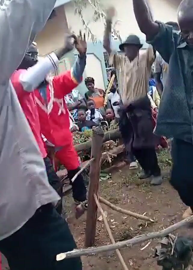 A group of people are gathered outdoors, seemingly celebrating or participating in a ritual. Several individuals are dancing with their arms raised. One person wears a red suit with white accents and a blonde wig. Others are dressed in casual attire. Some people are holding long sticks or leaves. In the foreground, there's a makeshift structure made of wooden sticks. In the background, a building is visible, and there are some children watching the event. The ground appears to be grassy and somewhat muddy. The atmosphere seems lively and energetic.
