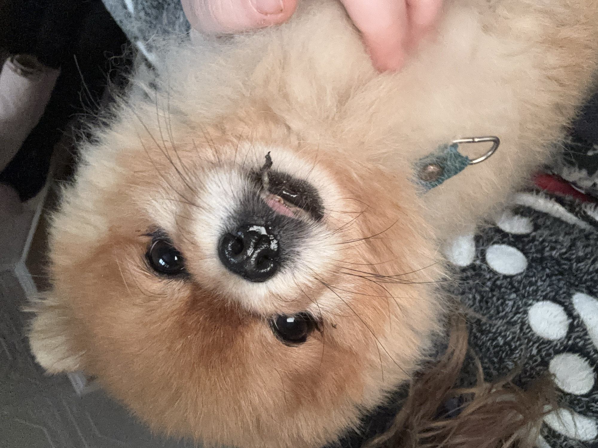 A close-up, slightly rotated image features a Pomeranian dog held upside down. The dog has tan and cream fur, a black nose, dark eyes, and whiskers. A finger is visible near the top of the image, suggesting someone is holding the dog. The dog wears a light blue collar with a silver D-ring. The background includes a patterned blanket or clothing in black and white polka dots and some strands of brown hair. No information suggests a location in Engels, Russia.