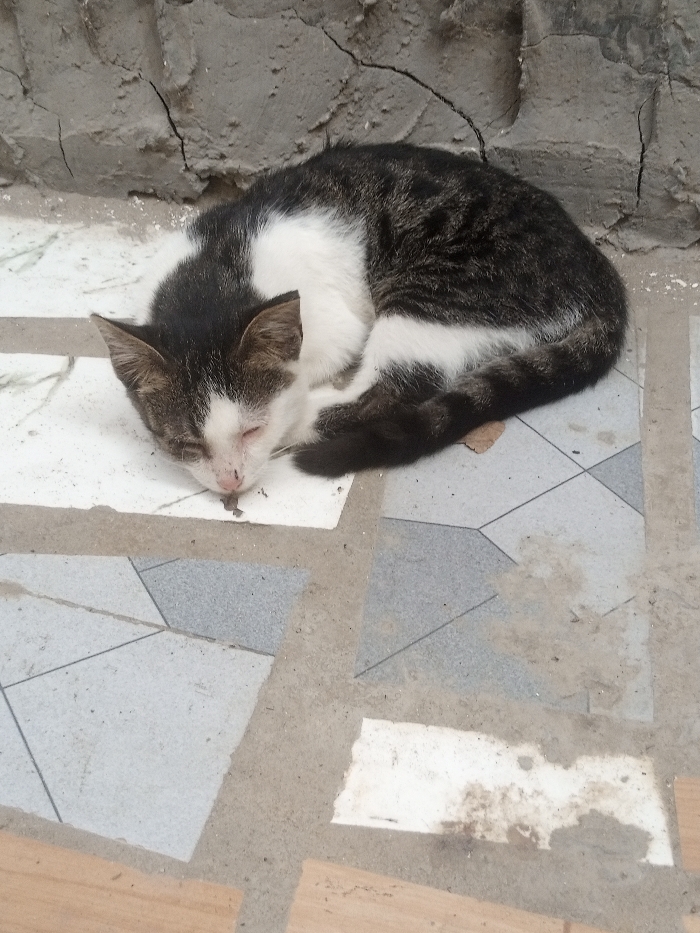 A black and white domestic cat is depicted sleeping curled on a tiled ground surface in Mtopanga ward, Kenya