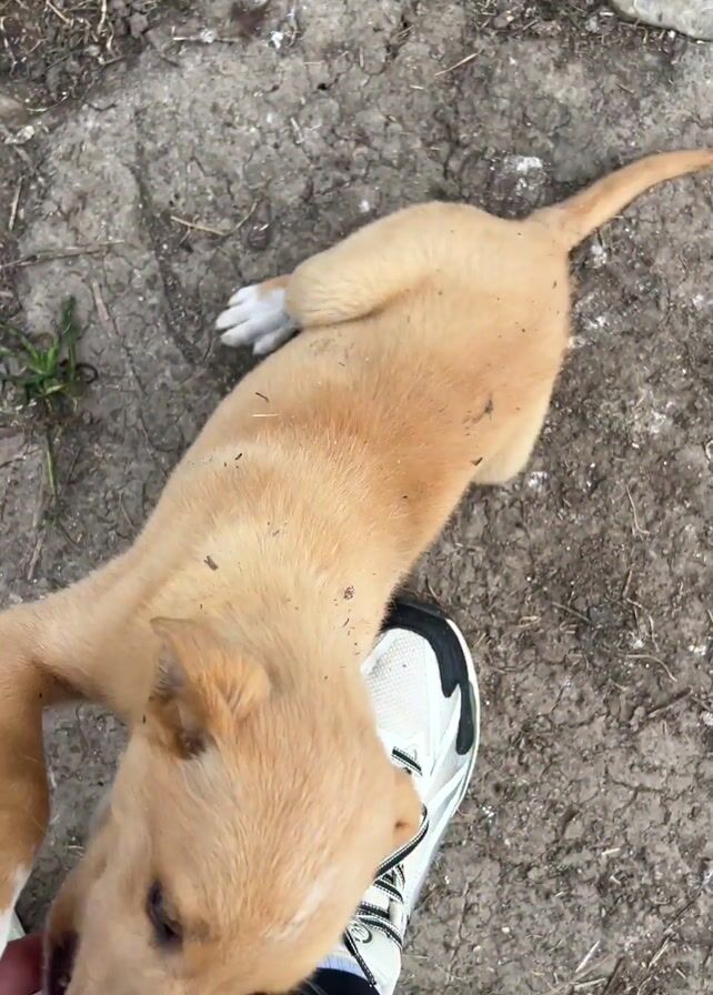 person holding a small, tan puppy. The puppy is covered in dirt and has white paws. The person is wearing sneakers and a bracelet. The puppy is barking and trying to bite the person's hand. The background is a dirt and stone area.