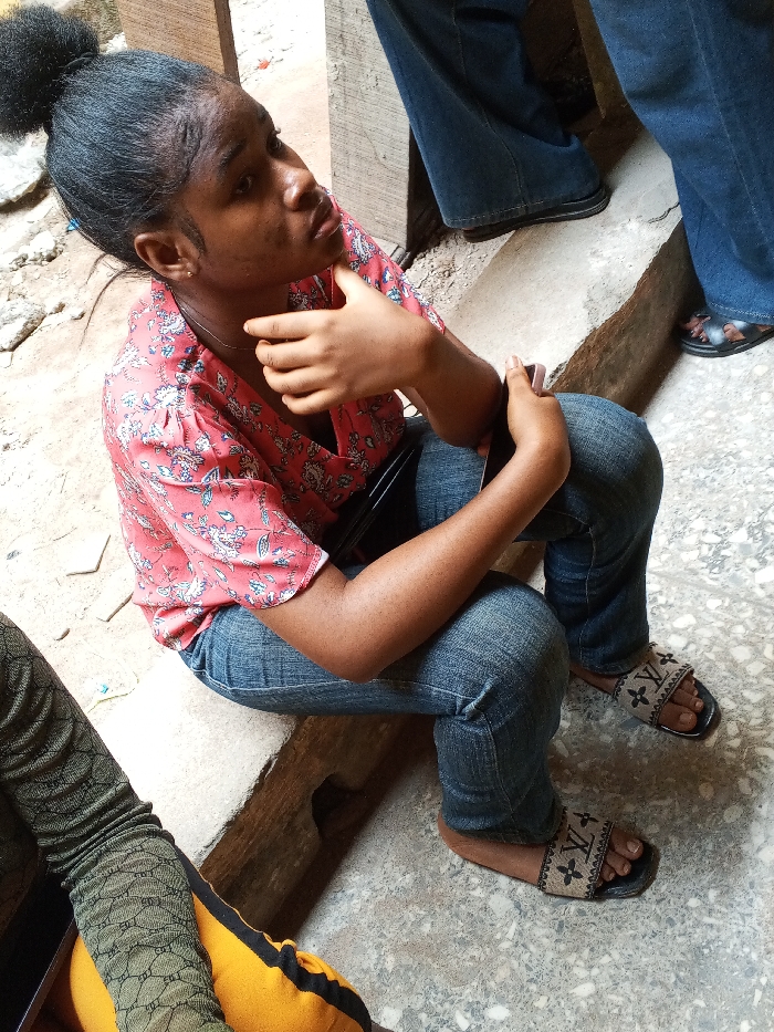 A young Black female is seated on a concrete ledge in an outdoor or semi-enclosed area within Ihiagwa, Nigeria