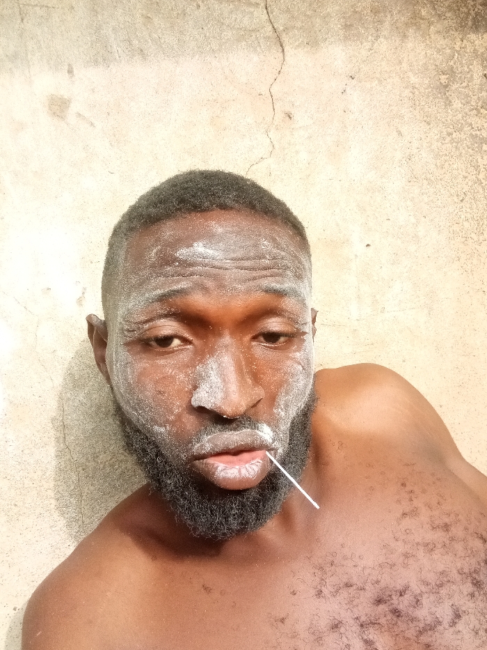 A shirtless man with dark skin poses for a selfie, his face covered in a white powdery substance, with a toothpick held between his lips