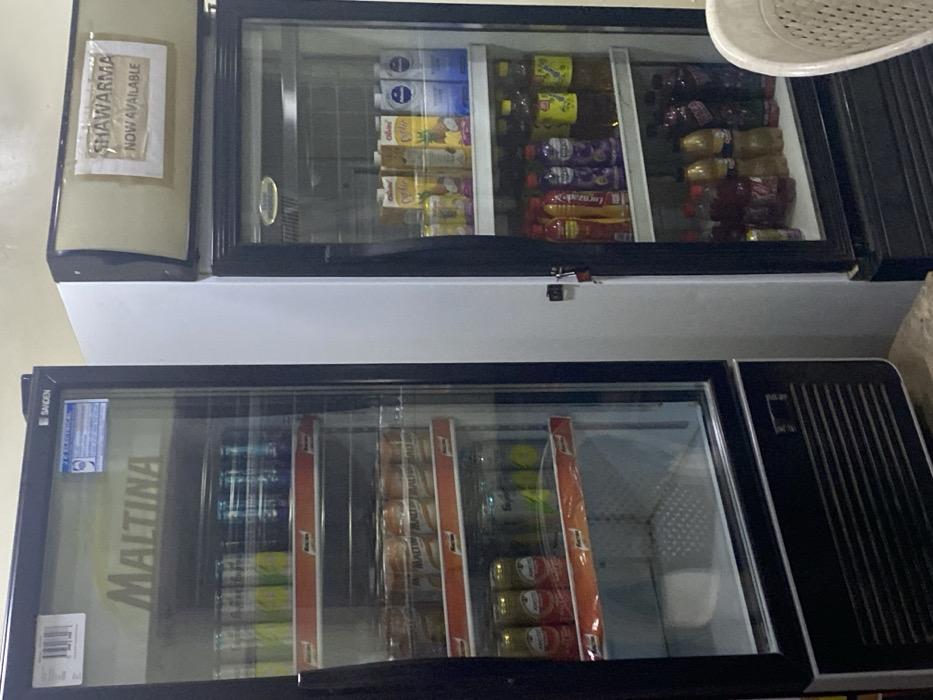 Two commercial refrigerators stacked on top of each other are filled with assorted beverages. The upper unit contains fruit juices and soft drinks in various flavors, including pineapple and grape. A sign indicating "Shawarma Now Available" is affixed to the upper left corner. The lower unit predominantly holds cans of Malta, a non-alcoholic malt beverage, with prominent "Maltina" branding visible on the glass door.