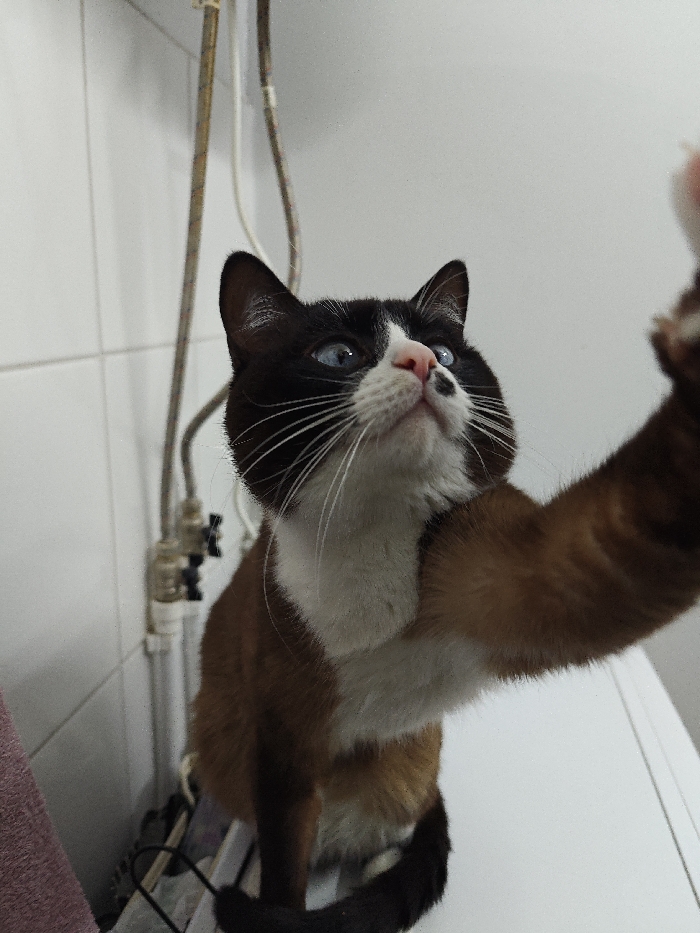 A brown, black, and white cat with blue eyes looks upward, seemingly reaching with a brown paw. The cat has a white chest and face with a pink nose. A black patch covers the top of its head. The background includes a tiled wall with exposed pipes and valves, giving the impression the cat is in a bathroom. The composition focuses on the cat's expression and interaction with something out of frame.