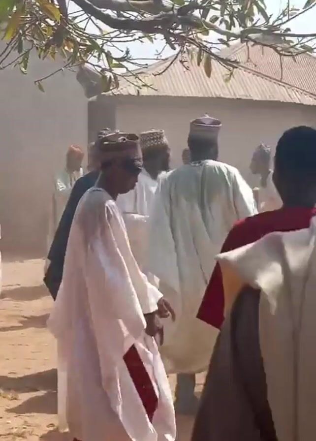 group of people gathered outside a building. Many of the men are dressed in traditional robes and hats. Some individuals are wearing sunglasses. There are a few children present, one of whom is carrying an orange bowl, and another carrying a bucket on her head. The building has a corrugated metal roof, and the words "MR. DON ON DE 6IT" are written on it. A tree branch with sparse leaves hangs in the foreground. The ground appears to be dusty. Some of the people seem to be moving towards the building, while others are standing around, conversing. A loud musical tune plays in the background.