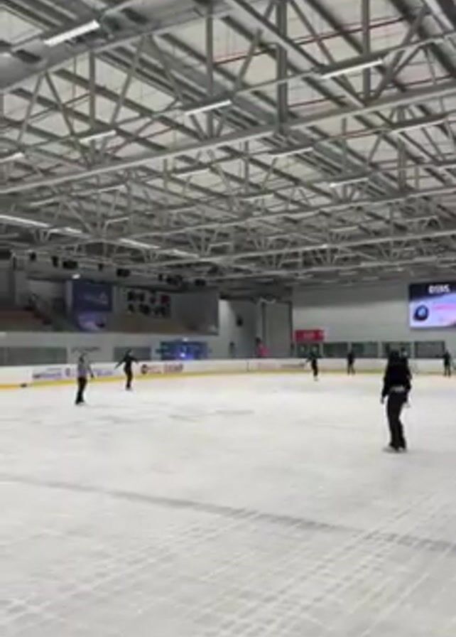 wide, brightly-lit ice rink with multiple ice skaters practicing